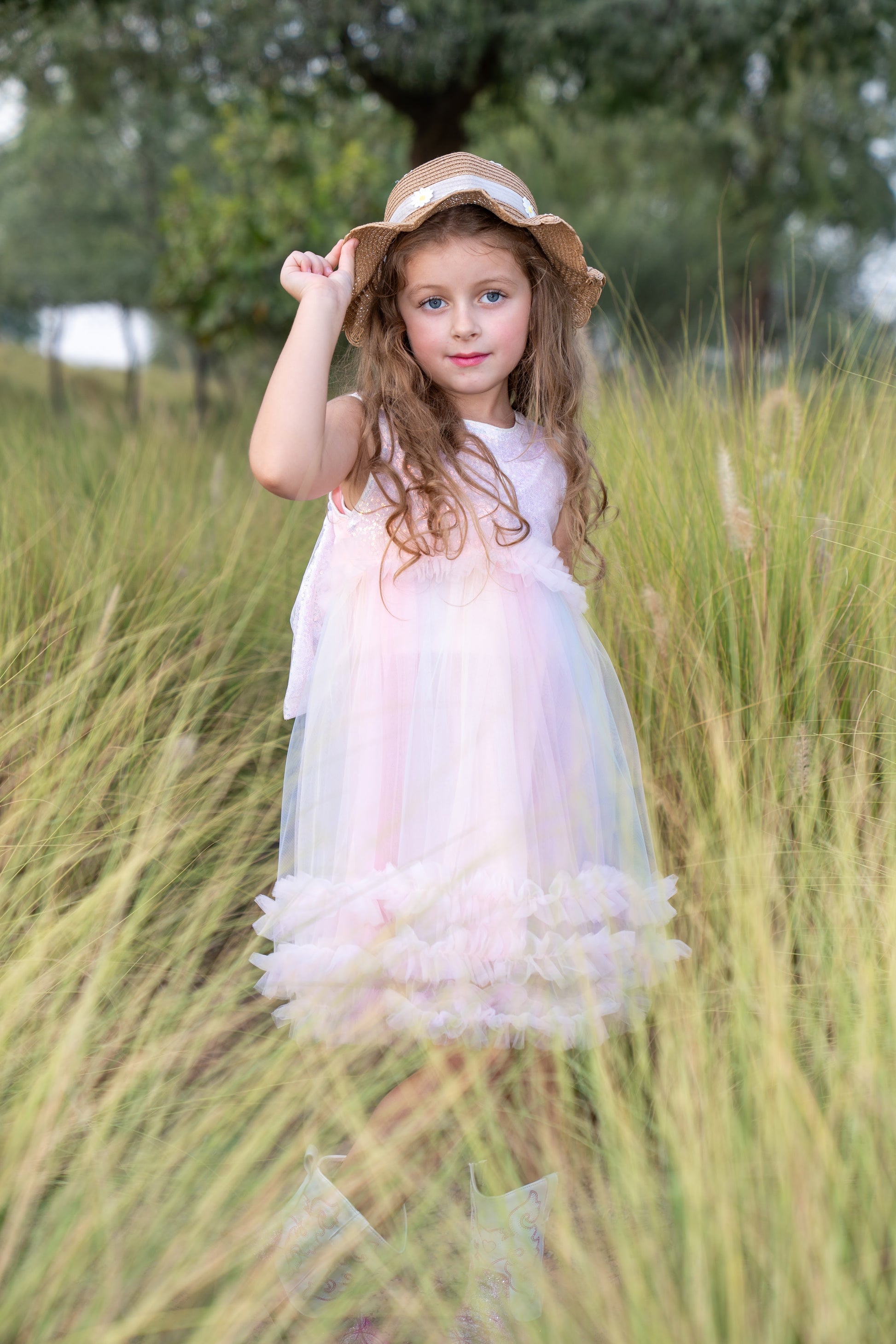 A stunning blush pink Bow tulle dress with a delicate hint of lavender, perfect for little girls. Made from soft, lightweight layers of tulle, the skirt is beautifully layered and topped with sparkling sequins for a touch of magic.