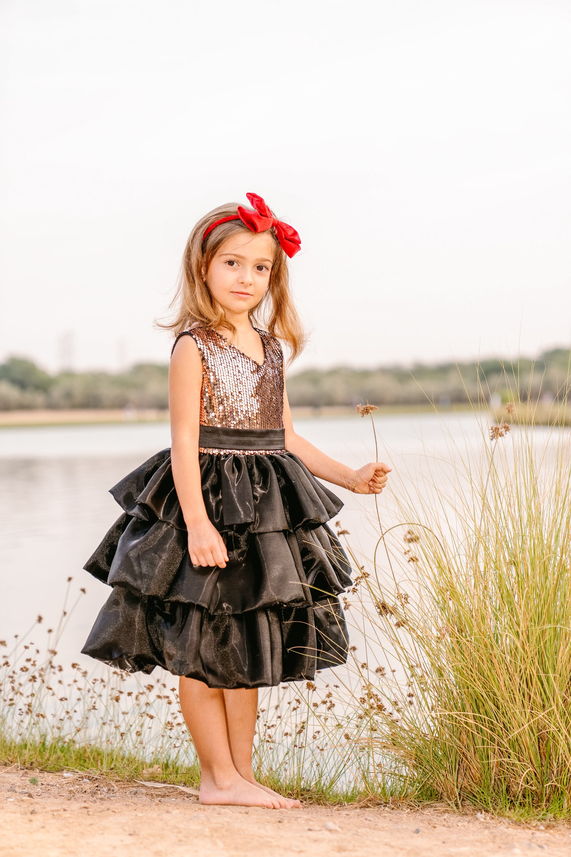 A stunning black and gold sleeveless dress for girls by Mama’s Love Kids, perfect for parties and special occasions. This beautiful piece features a layered bubble skirt crafted from shiny, silky fabric that creates a gorgeous, voluminous silhouette with every step.