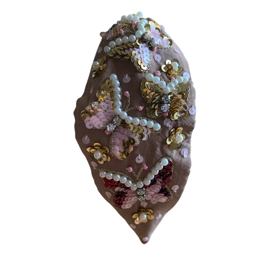 Handbeaded Headband Turban - Butterfly Rose Pink with Golden Sequins & Pearl Beads